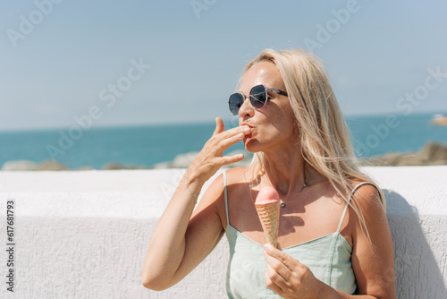 A woman eats melting ice cream and licks her fingers on a hot summer day.