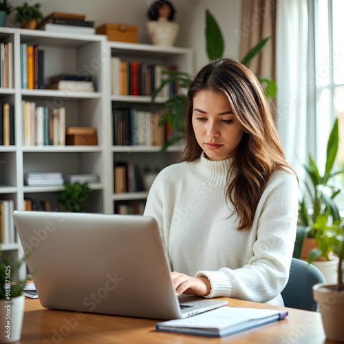 woman, sweater, laptop, office, book, plant, focused, calm, desk, modern, light, window, shelf, workspace, cosy, home, productive, work, background, typing