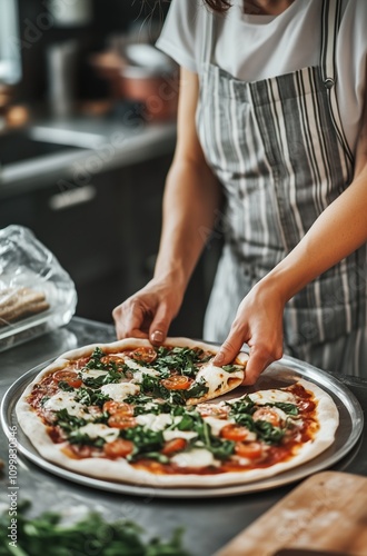 woman, making, pizza, spinach, tomatoes, wearing, apron, slice, cutting, food, meal, italian, cheese, homemade, kitchen, dinner, delicious, dough, tasty, table, person, lunch, eat, preparation, cooking, cookery, lifestyle, mozzarella, fresh, vegetable, adult, pizzeria, female, pepperoni, baked, chef, sauce, caucasian, flour, salami, wooden, hand, cookery, eatery, pastry, white, ingredient, rustic, fast