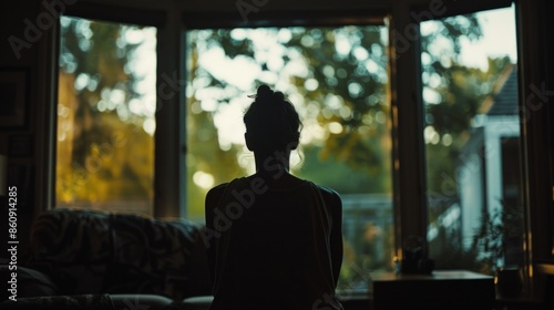 A woman is sitting in a living room with a view of trees outside. Generate AI image