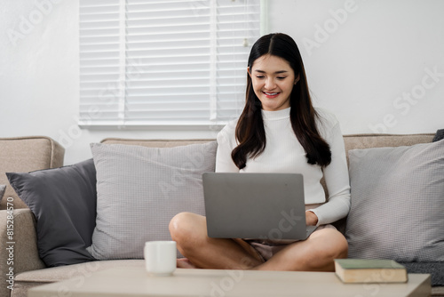 laptop, computer, home, woman, female, technology, sofa, sitting, lifestyle, young, happy, couch, room, adult, cyberspace, online, person, smile, indoor, using, house, apartment, communication, business, leisure, living, looking, typing, modern, wireless, beautiful, work, notebook, freelance, relaxing, casual attire, attractive, student, mobile, device, asian, quarantine, pretty, professional, reading, job, smartphone, phone, content
