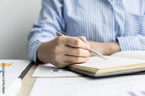 A woman is taking notes in a notebook, she works from home due to the epidemic, she records details of tasks assigned by her supervisor through a video conference. The idea of working from home.