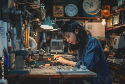 A woman making jewelry in her office filled with tools.