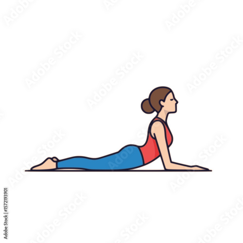 yoga, pose, woman, cobra, exercise, meditation, stretching, flexibility, health, wellness, posture, body, female, lying, stomach, practice, asana, red, blue, clothing, profile, outline, illustration, graphic, calm, peaceful, mindfulness, fitness, sport, gym, physical exercise, training, pilates, healthy, beauty, person, slim, fit, gymnastics, people, lifestyle, mat, aerobic, 1, studio