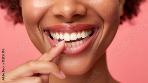 a woman points her finger at her teeth --ar 16:9 --style raw Job ID: 310fc762-c3da-45a8-8816-f6f4eed33f2a