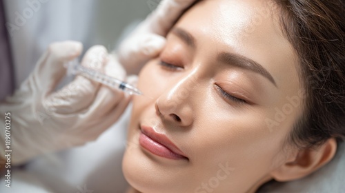 A woman receiving an aesthetic treatment, with a practitioner administering an injection to enhance her facial features.