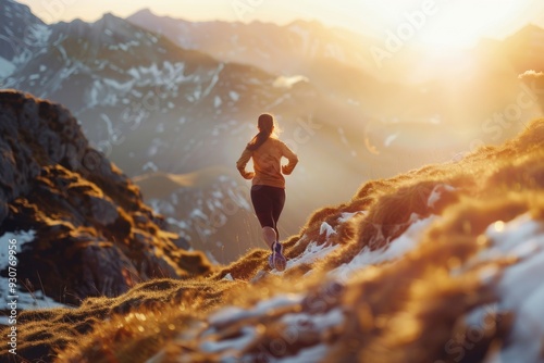 woman, running, mountain, trail, sunset, athlete, fitness, exercise, adventure, recreation, nature, landscape, scenery, evening, gold, hours, hill, terrain, slope, hike, mountainside