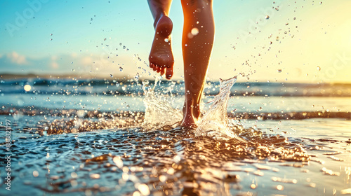 woman, foot, ocean, beach, water, run, splash, droplet, barefoot beach, sand, sea, sky, blue, bright, sunlight, sunset, summer, nature, movement, freedom, vitality, happiness, joy, travel, vacation, holiday, relaxation, coastal, shoreline, gold, hours, light, warm, soft, gentle, beautiful, peaceful, elegant, joyful, calm, serene, fresh, high-coloured, realistic, telephoto, natural, shutter