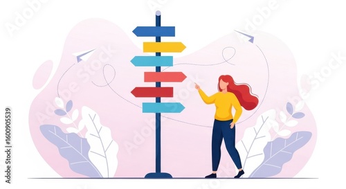 choice, decision, path, direction, woman, signpost, crossroad, fork, road, way, future, opportunity, strategy, planning, career, business, life, option, alternative, guidance, selection, picking, choosing, person, female