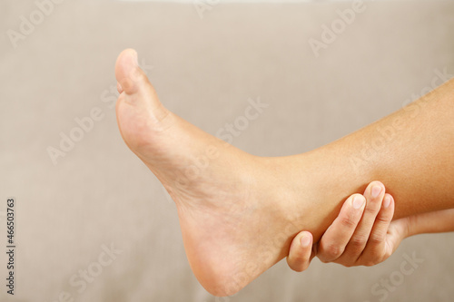A woman suffering from feeling knee pain sitting sofa at home. hand massaging her painful knee. Health care and medical concept.
