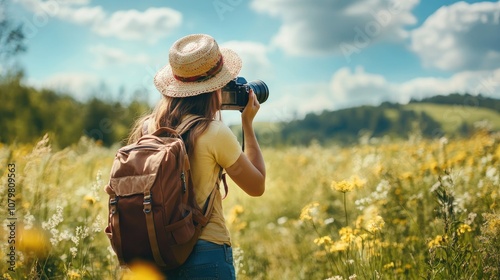 woman, hat, backpack, wildflower, field, photo, camera, nature, summer, travel, adventure, scenic, landscape, green, blue, sky, cloud, sunny, day, outdoors, happy, hobby, relax, explore, freedom, beauty, joy, peace, calmness, beautiful, peaceful, serene, yellow, bright, vibrant, colourful, flora, botany, plant, flower, meadow, hill, mountain, hilltop, vista, view, perspective