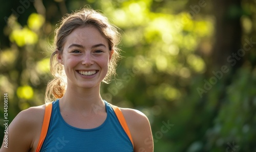 woman, blue, tank, top, orange, strap, smiling, female, person, young, adult, portrait, beauty, happy, lifestyle, fitness, summer, lady, athlete, sport, outdoors, physical exercise, healthy, active, health, fit, exercise, attractive, caucasian, training, park
