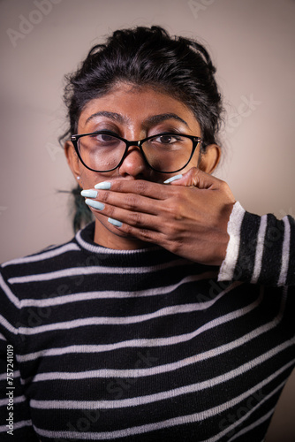 A woman with glasses is holding her mouth shut. She is wearing a striped shirt. Concept of seriousness and restraint