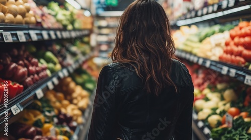 ai, person, shopping, woman, long, hair, dark, leather, jacket, grocery, store, produce, fruit, vegetable, fresh, aisle, shelf, colourful, basket, selecting, buying, healthy, food, nourishment, lifestyle, consumerism, supermarket, retail, client, market, inside, indoor, day, daytime, casual attire, clothing, fashion, female, adult, young, section, cart, bag, eating, organic, browse, service, fruit, vegetable