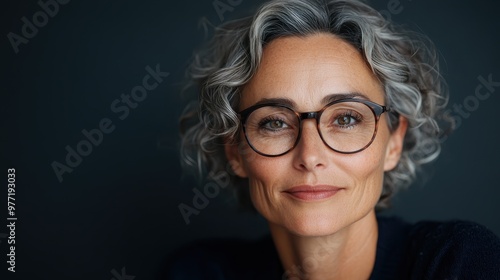 A woman with short, curly gray hair wears stylish eyeglasses and a slight smile. Her cool demeanor and confident vibe exude modern stylish elegance.