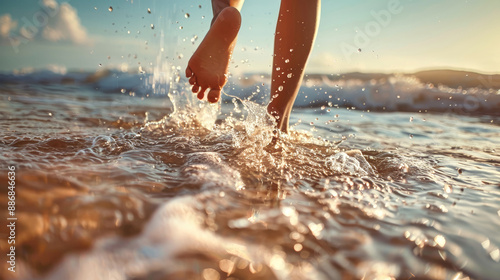 foot, running, beach, water, sea, ocean, sand, sun, sunlight, wave, splash, spray, barefoot beach, shore, coastline, summer, vacation, travel, happy, joy, carefree, freedom, relaxation, nature, landscape, closeup, fisheye, natural, light, soft, tone, realistic, joyful, gold, hours, oceanfront, sport, summer, active, walking, leg, movement, shallow, oceanside, holiday