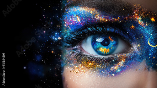 A woman's eye is painted with a galaxy design. The eye is surrounded by a blue and gold swirl of glitter. The eye is the main focus of the image, and the galaxy design adds a sense of wonder