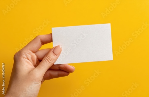 A woman's hand delicately holds a blank white card against a vibrant yellow background, showcasing a minimalist design perfect for your next project.