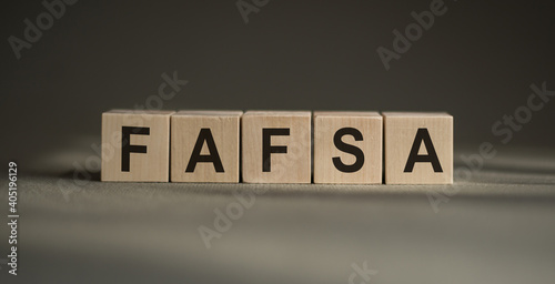 A wooden blocks with the word FAFSA written on it on a gray background.