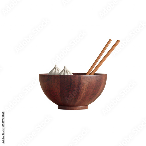 A wooden bowl filled with delicious dumplings, paired with chopsticks. Ideal for showcasing Asian cuisine and dining culture.