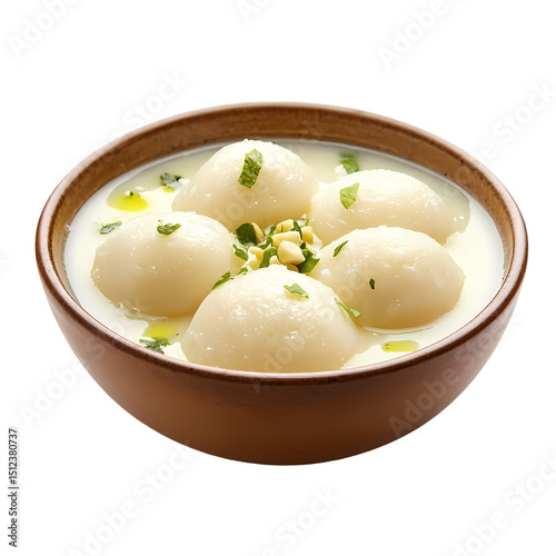 A wooden bowl filled with rasmalai dessert garnished with pistachios and herbs on a black background isolated on transparent background