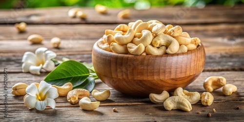 cashew, wooden, bowl, scattered, half, flower, nut, beige, white, photo, prop, decor, rustic, natural, organic, healthy, food, ingredient, culinary, kitchen, table, setting, arrangement, composition, shot, image, photo, visual, creativity, texture, pattern, form, closeup, detail