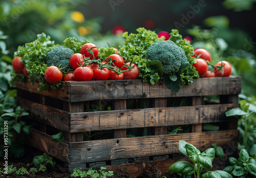 A wooden crate filled with fresh vegetables including tomatoes, broccoli, and lettuce. The crate is placed in a garden setting, surrounded by various plants and flowers