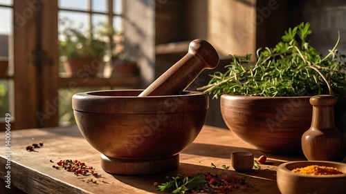 A wooden mortar and pestle with a rich grain texture, grinding fresh herbs and spices in a sunlit kitchen
