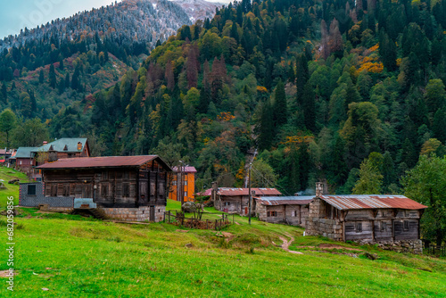 A wooden plateau house integrated with the forest that turns yellow with the autumn season. Plateau houses are made of stone and wood. Old stone houses. Rize, Turkey.