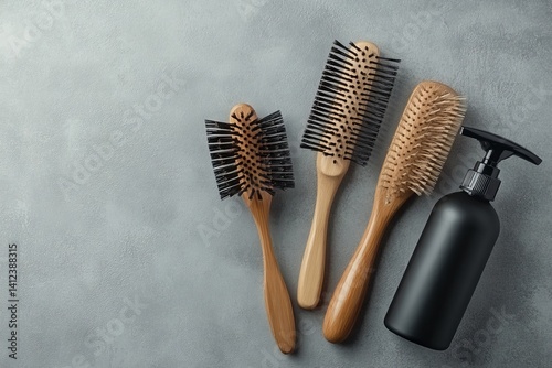 shampoo, comb, gel, barrette, concept, copy, salon, beauty, space, background, modern, set, racked, supply, dryer, hair care, design, hair, view, style, accessory, dye, group, barber, styling, shop, closeup, wooden, scissors, professional, tool, fashion, wood, care, equipment, table, work, beige, trendy, hairdresser, spray, composition, black, many, brush, grey, barbershop, top, plastic