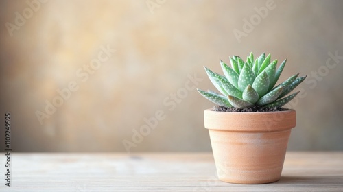 A workspace with a wooden desk, a clean desktop, and a potted succulent,