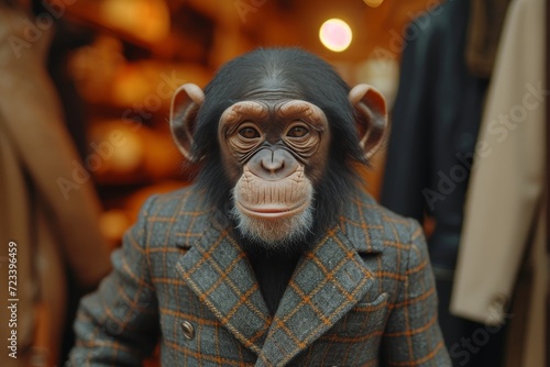 wrinkle, indoor, person, standing, chimpanzee, jacket, playful, visionary, physical, colours, emotion, concept, style, object, picture, unique, keyword, list, 45, photo, delightful, curious, intelligent, cute, furry, animal, fashion, extraordinary, unexpected, charismatic, amusing, quirky, whimsical, captivating, endearing, dapper, mischievous, clever, expressive, surreal, artful, surprising, imaginative, comical, fascinating, brash, adorable