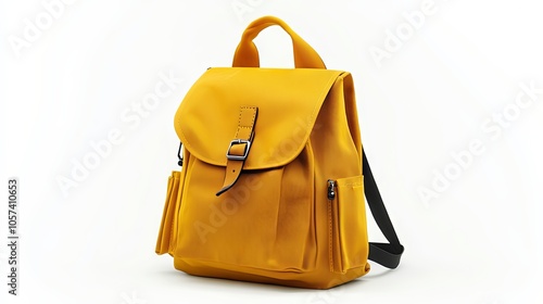 A yellow backpack front view, isolated on white. Subject photography of stylish yellow backpack in casual style on white background. Yellow knitted backpack with yellow inserts and handles.