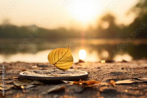 a yellow leaf sits on the ground next to a lake at sunset