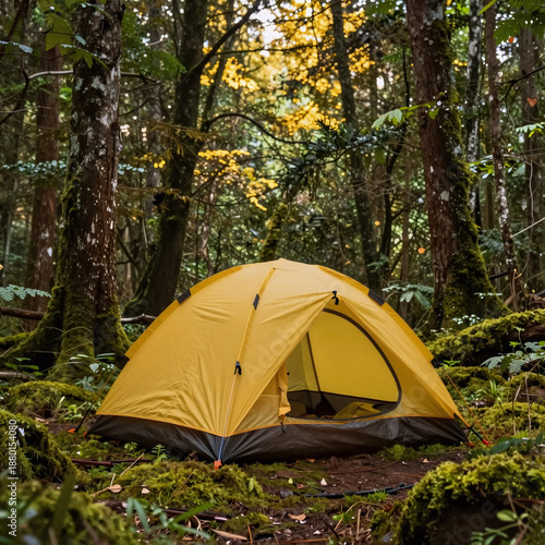 A yellow solo tent in a lush, mossy forest with tall trees and golden sunlight suggests wilderness exploration adventure and solitude