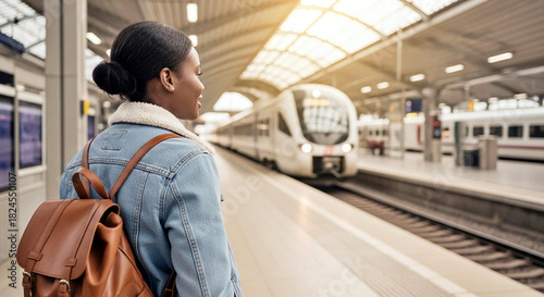 travel, train, platform, woman, urban, station, journey, commuter, public transport, waiting, backview, black woman, backpack, denim, jacket, sunny, traveler, architecture, railway, track, routine, young, female, casual attire, destination, long distance, adventure, tour tourism, transportation, modern, lifestyle, city, smile, happy, morning, transit, structure, sharpened, soft light, passenger, terminal, adult, warm, infrastructure, arrival, trip, anticipation, walking