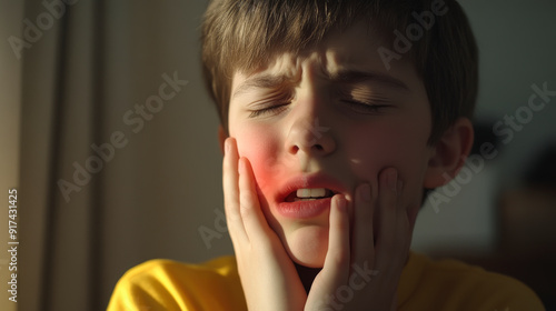 A young boy holds his face in discomfort, eyes closed, seemingly experiencing pain. He is wearing a yellow shirt with a background of dim lighting.