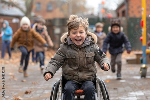 A young boy in a wheelchair is smiling as he rides down a sidewalk. The other children are playing nearby, and the scene is lively and joyful