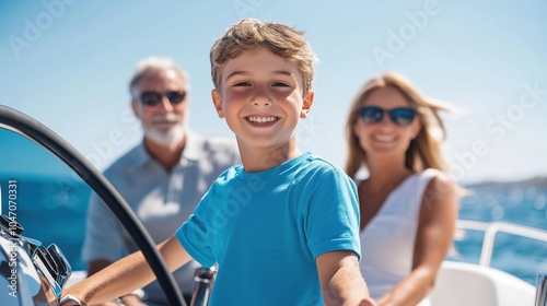 young, boy, smiling, driving, boat, bright, cheerful, people, shining, family, blue, sun, wearing, father, shirt, happy, happiness, daughter, son, mother, together, children, childhood, summer, outdoors, fun, portrait, man, park, love, caucasian, nature, togetherness, joy, leisure, bonding, embracing, day, sunlight, lifestyle, children, walking, adult, vacation, outside, holiday, grandson, little