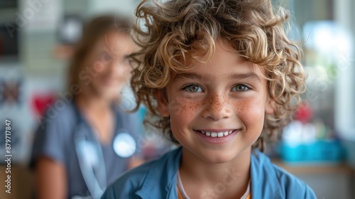 boy, smile, curly hair, medicals, innocence, warmth, hospital, doctor, young boy, children, happiness, youth, trust, health, care, positive, safe, calm, modern, health care, medical professional, happy child