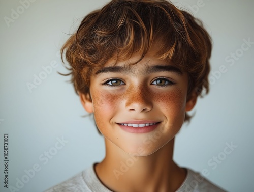 young, boy, freckle, face, smiling, camera, bang, children, eye, freckle, hair, haircut, short, smile, closeup, portrait, bright, looking, styled, messy, curly, styled, small, wavy, curl, wearing, grey, t-shirt, background, light, blue, colours, sharpened, eye, nose, mood, cheerful, playful