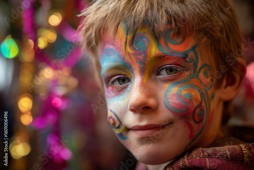 A young boy with intricate face paint beams with joy at a fair, immersed in a lively atmosphere filled with colorful decorations and festive elements