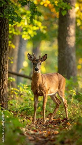 buck, cervid, forest, path, tree, wildlife, nature, animal, outdoors, sunlight, leaf, autumn, timberland, mammal, horn, antler, young, brown, green, dappled, sharpened, tranquil, serene, environment, portrait, standing, beautiful, natural, ecosystem, closeup