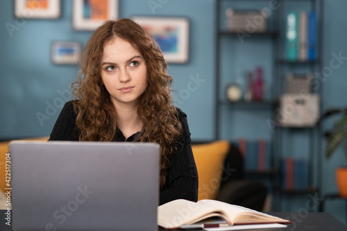 A young college girl is wondering what to write back to an email she received. The girl is sitting at a desk in a cozy living room using her laptop. The smiling teenage girl is studying remotely.