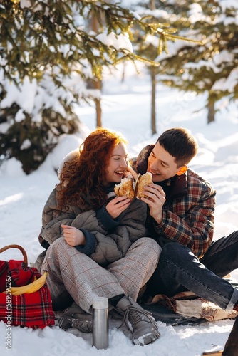A young couple spends a day off at a picnic in the winter forest. Smiling young people sit in the middle of a winter forest and eat pancakes.