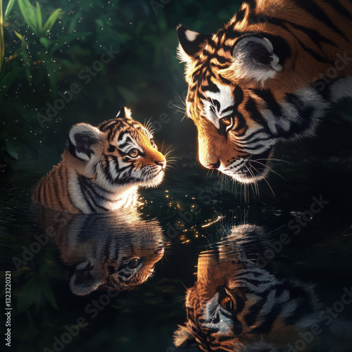 A young cub staring at its reflection in the water, which morphs into the shape of a large, majestic tiger