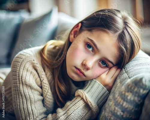 A young girl curls up on a soft couch, her head resting on her hand, gazing thoughtfully towards the distance. The warm light filters through the windows, creating a serene atmosphere