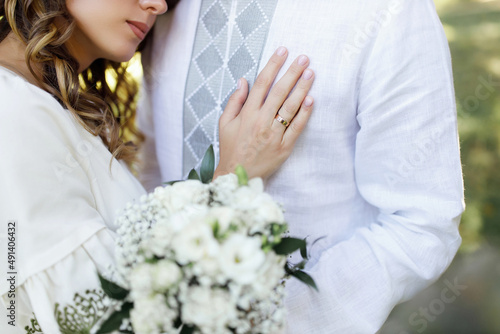 A young girl in love put her hands on the heart of a man with a bouquet of beautiful flowers in a national shirt, no faces