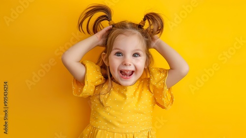 A young girl with pigtails, wearing a bright yellow dress, is playfully holding her head with both hands and making a funny face. The cheerful yellow background enhances her amusing expression