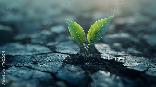 A young green plant sprouts from dry cracked earth symbolizing resilience and new life